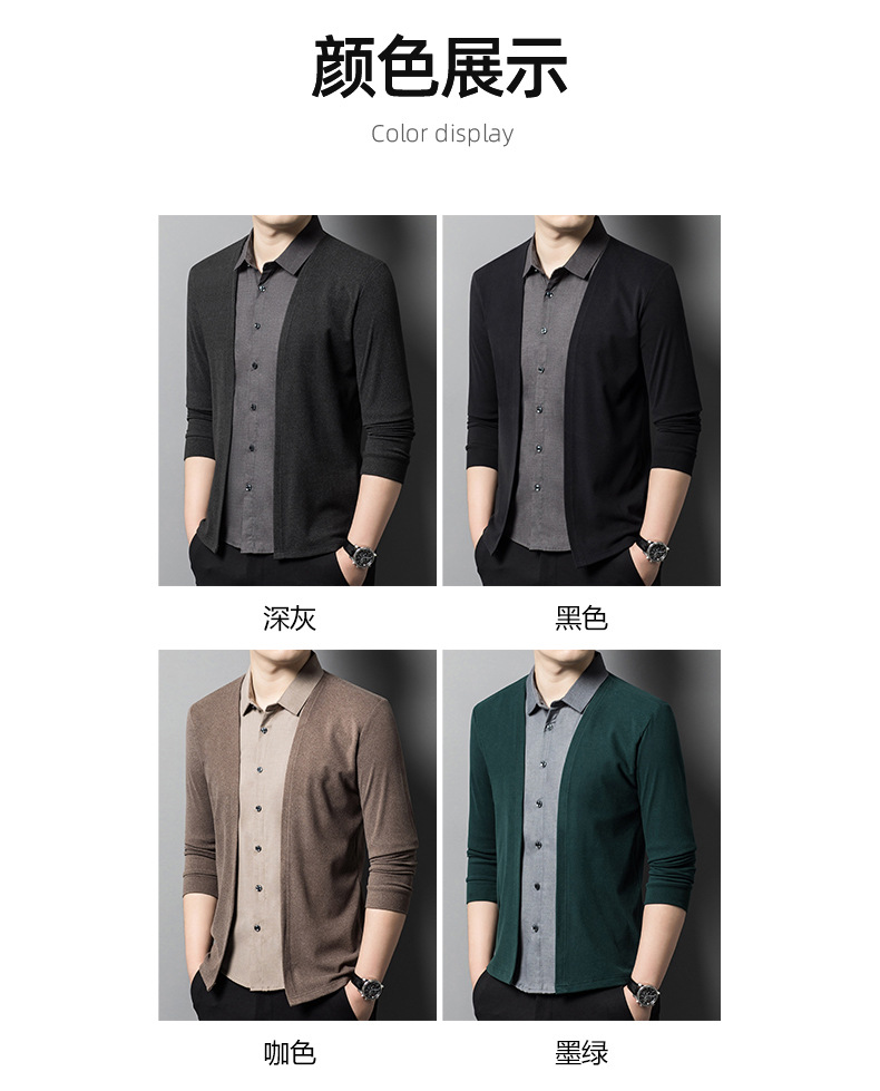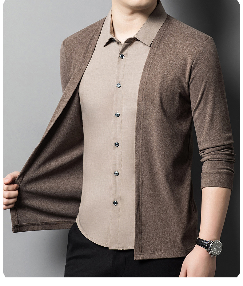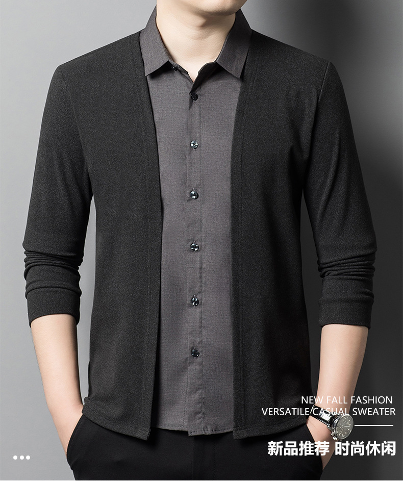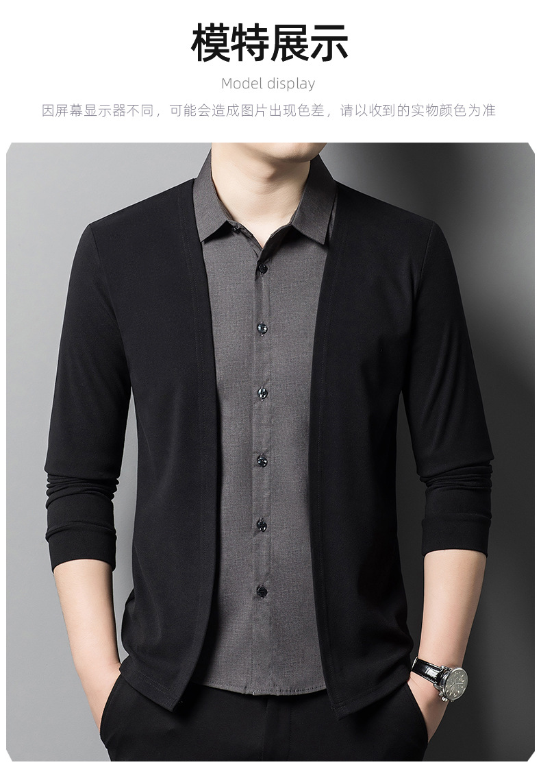 新款中青年男士长袖衬衫假两件开衫休闲发热双面德绒高弹潮流男装