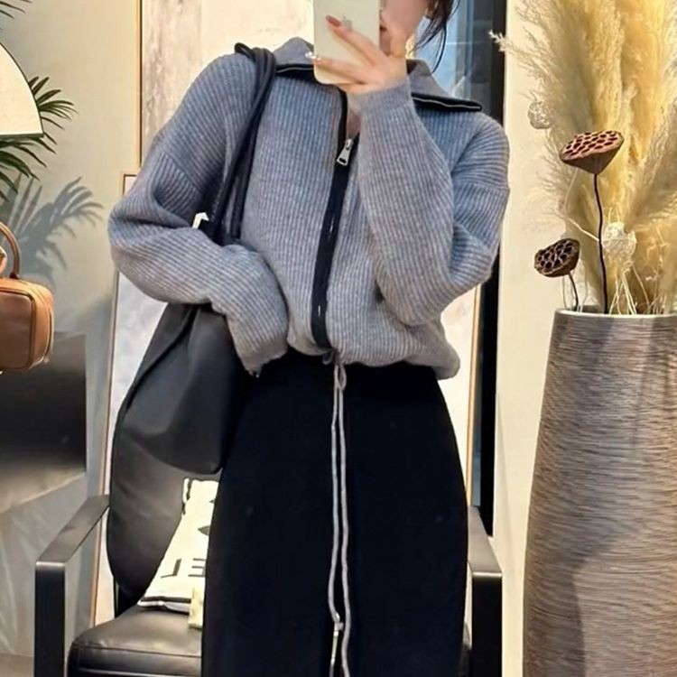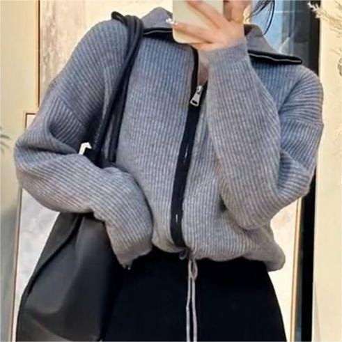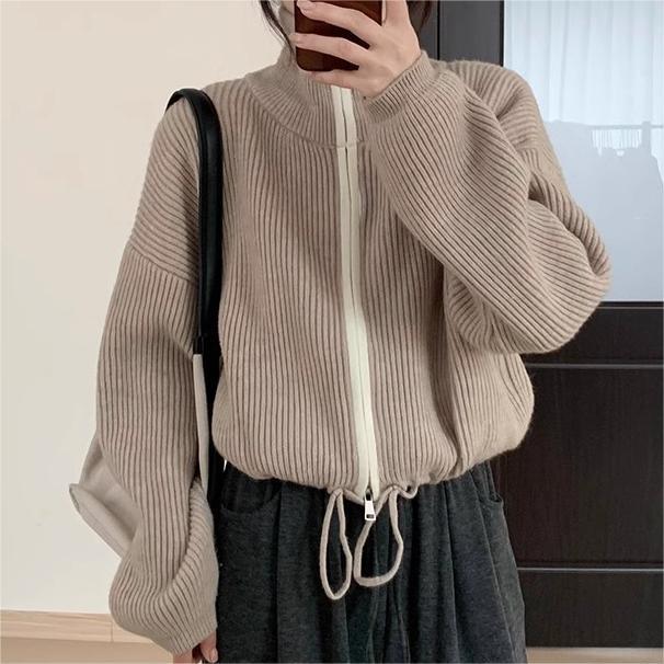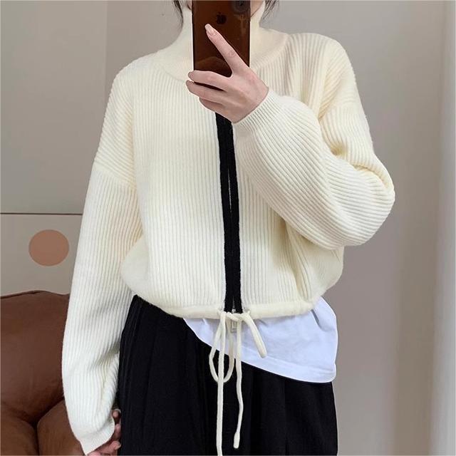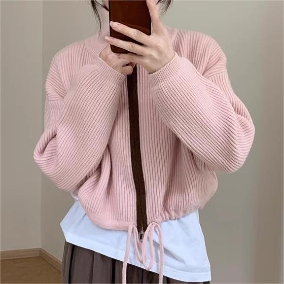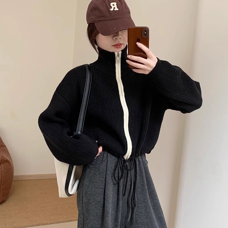 时尚女装设计感下摆抽绳立领短款毛衣女百搭显瘦上衣