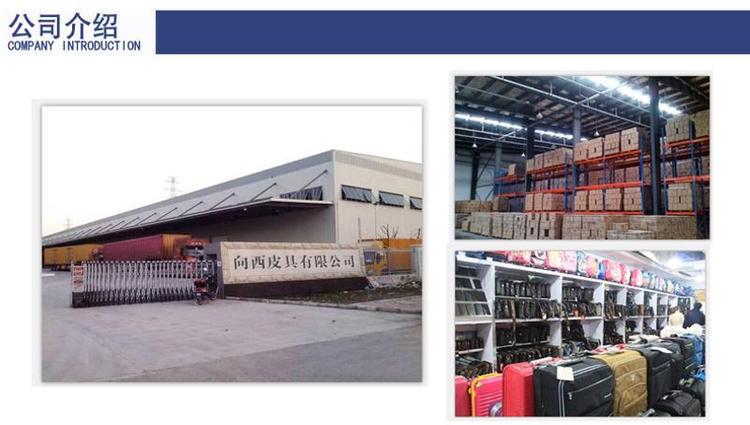 向西箱包商行是拉杆箱、拉杆旅行包、旅行包、儿童书包、电脑包等产品生产加工的公司,拥有完整、 科学的质量管理体系。向西箱包商行的诚信和产品质量获得业界的认可。欢迎各界朋友莅临参观、指导和 业务洽谈。
